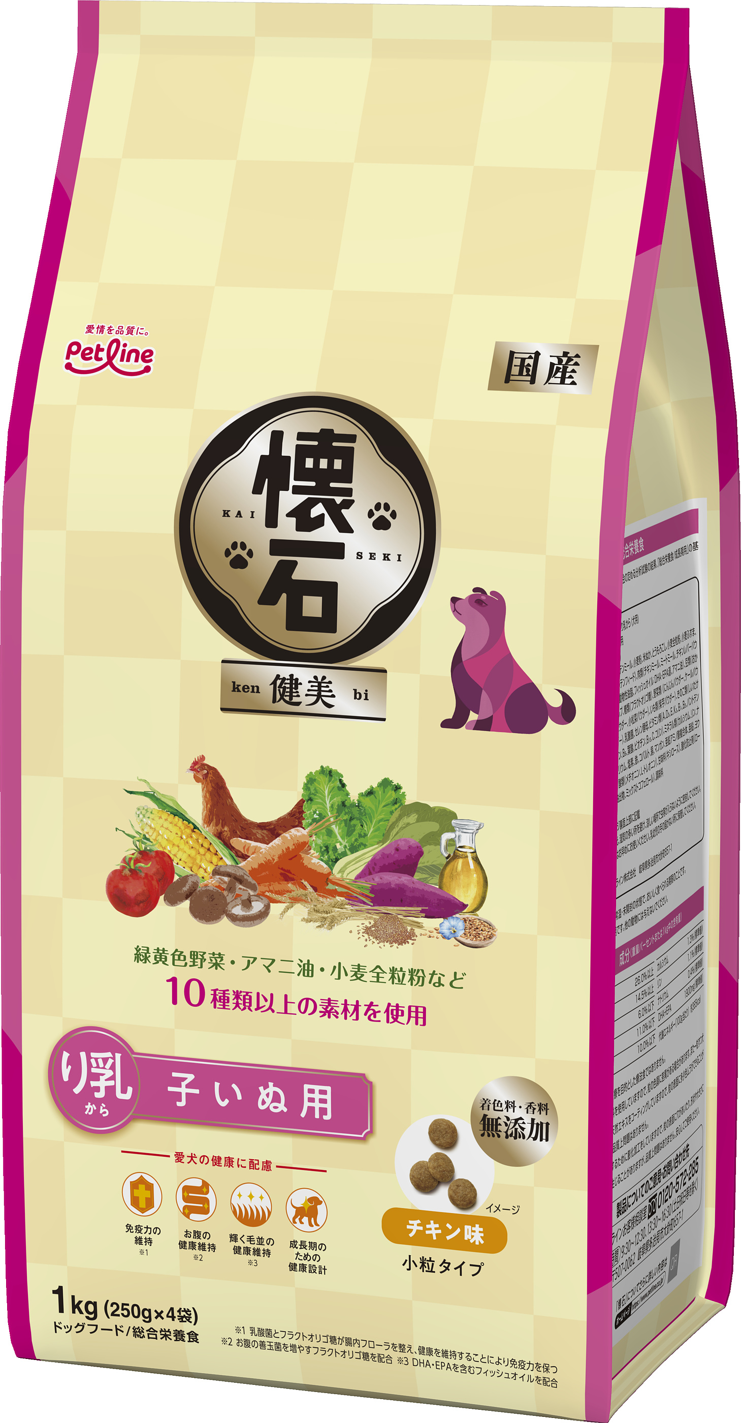 穀類(コーングルテンミール、小麦粉、米ぬか、とうもろこし、小麦全粒粉、小麦ふすま、米粉、コーングルテンフィード)、肉類(チキンミール、ミートミール、チキンレバーパウダー)、油脂類(動物性油脂、フィッシュオイル:DHA・EPA源、アマニ油)、豆類(おから)、ビートパルプ、糖類(フラクトオリゴ糖)、野菜類 (にんじんパウダー、ケールパウダー、トマトパウダー、小松菜パウダー)、いも類(紫芋パウダー)、きのこ類(しいたけエキスパウダー)、乳酸菌、セレン酵母、ビタミン類(A、D3、E、K3、B1、B2、パントテン酸、ナイアシン、B6、葉酸、ビオチン、B12、コリン)、ミネラル類(カルシウム、リン、ナトリウム、カリウム、塩素、鉄、コバルト、銅、マンガン、亜鉛アミノ酸複合体、亜鉛、ヨウ素)、アミノ酸類(メチオニン、L-トレオニン)、甘味料(キシロース)、酸化防止剤(ローズマリー抽出物、ミックストコフェロール)、調味料
